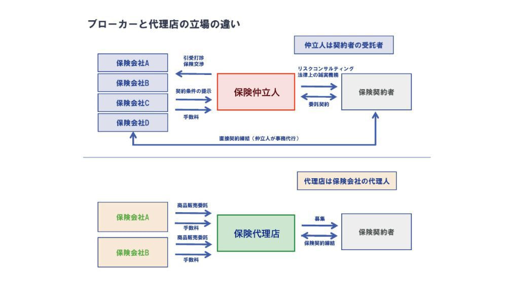 代理店は保険会社から委託を受けて、保険会社のために保険募集を行うのに対し、保険仲立人(保険ブローカー)は顧客(保険契約者)の委託を受けて、その顧客のために誠実に保険契約の締結の媒介にあたります。
